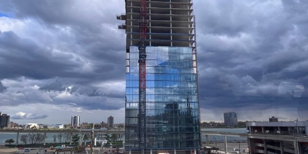 Múltiples fuentes me han dicho que el hotel propuesto de 600 habitaciones, que ha estado bajo consideración para una bandera de Marriott International, estaría conectado al centro de convenciones de Huntington Place a través de una pasarela. Sería aproximadamente del tamaño, o tal vez un poco más alto, que la torre de apartamentos, que tiene 25 pisos. Me han dicho que la palada inicial podría tener lugar en otoño o primavera.